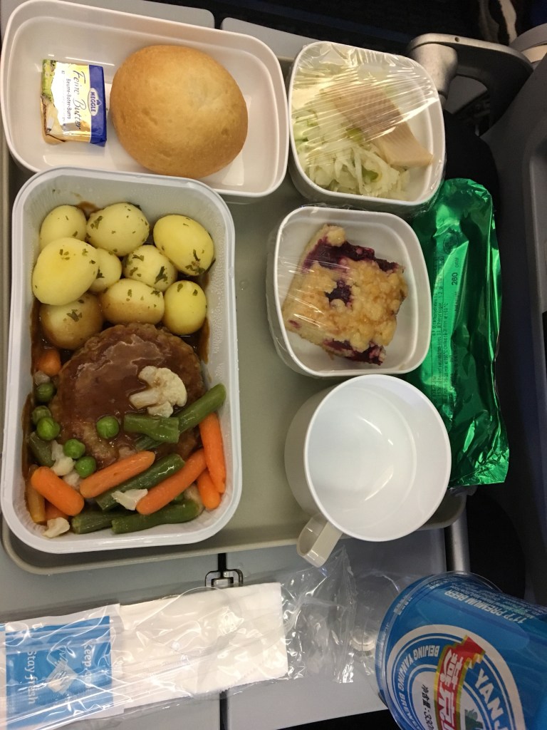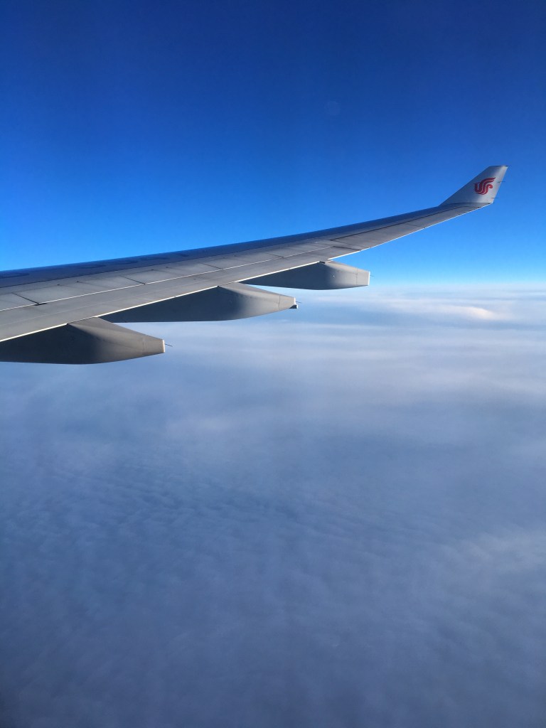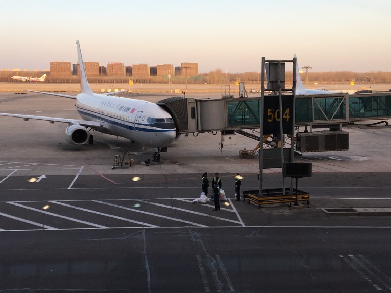 Ve 12:05 odlétáme do Pekingu. Letadlo je narvané a ne zrovna prostorné, ale nakonec cesta s Air China oproti varováním našich známých probíhá hladce. Po páté ráno vystupujeme v Pekingu a snažíme se zorientovat na letišti, kde si musíme nejdřív vyřídit tranzitní víza. Na probrání si dáváme kafe a vodu za 160 Kč.