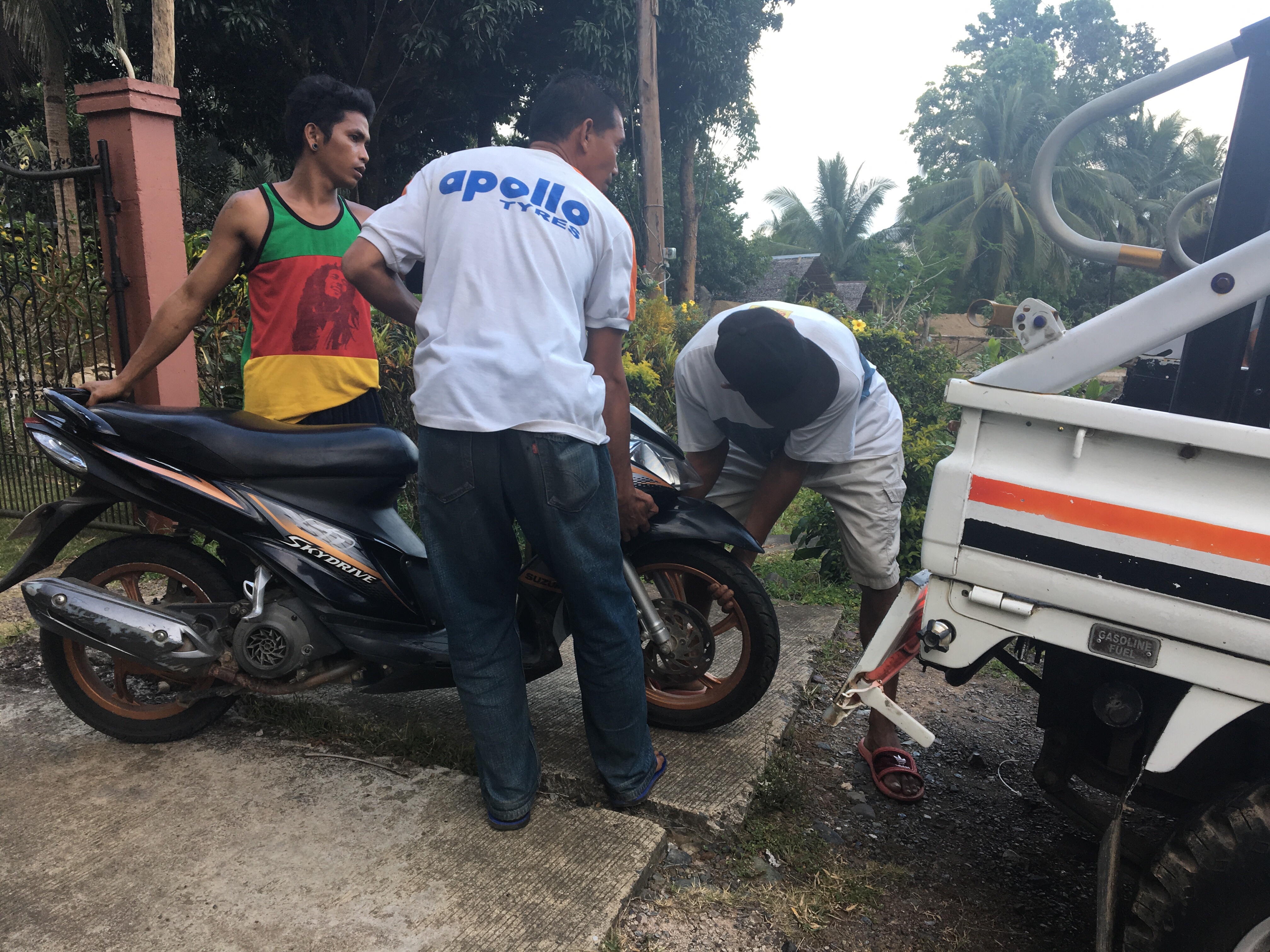 Po hodince a půl v motorce něco prasklo a my zůstali stát na krajnici 20 km před městem a hodinu před soumrakem. Super 👍 Na půjčovnu jsme neměli kontakt a ani ho nevygooglili – všechny se tam jmenovali stejně. Nebyla to úplně příjemná situace, ale zachránili nás místní lidé. Jeden přivezl dodávku a spolu dalšími čtyřmi skútr naložili, nás posadili do tříkolky a jeli 3 km k místnímu opraváři. Ten nám za chvilku podal prasklý klínový řemen, takže jsme dojeli.