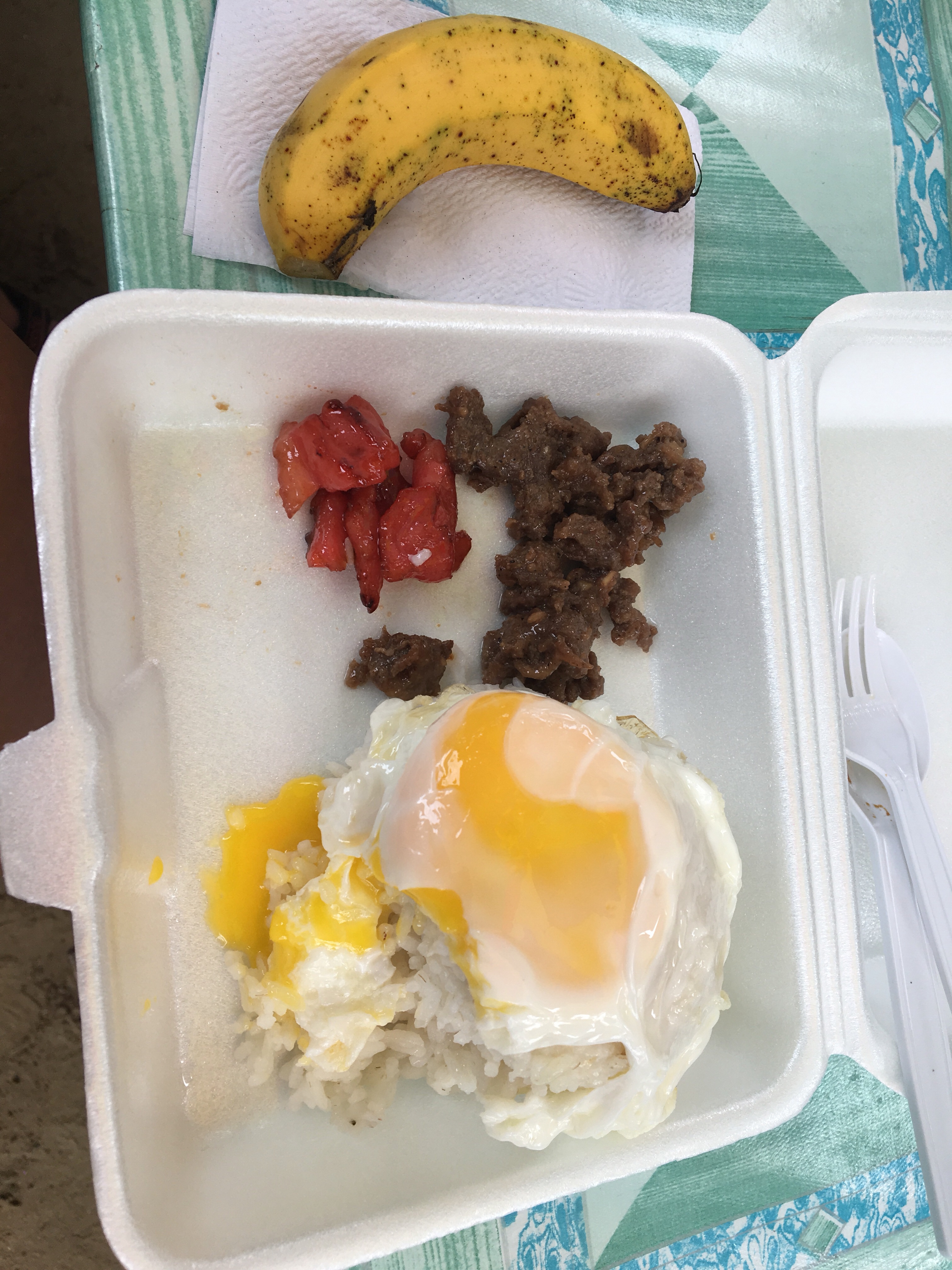 Nicméně hlavním úkolem dne bylo sehnat ubytování na noc ze čtvrtka na pátek, museli jsme se přestěhovat. Na asi pátý pokus se zadařilo ulovit na místní poměry levnou chatičku na pláži. Kousek opodál jsme si dali první typicky filipínskou snídani. Skládala se z rýže, naložených kořeněných plátků masa a volského oka.