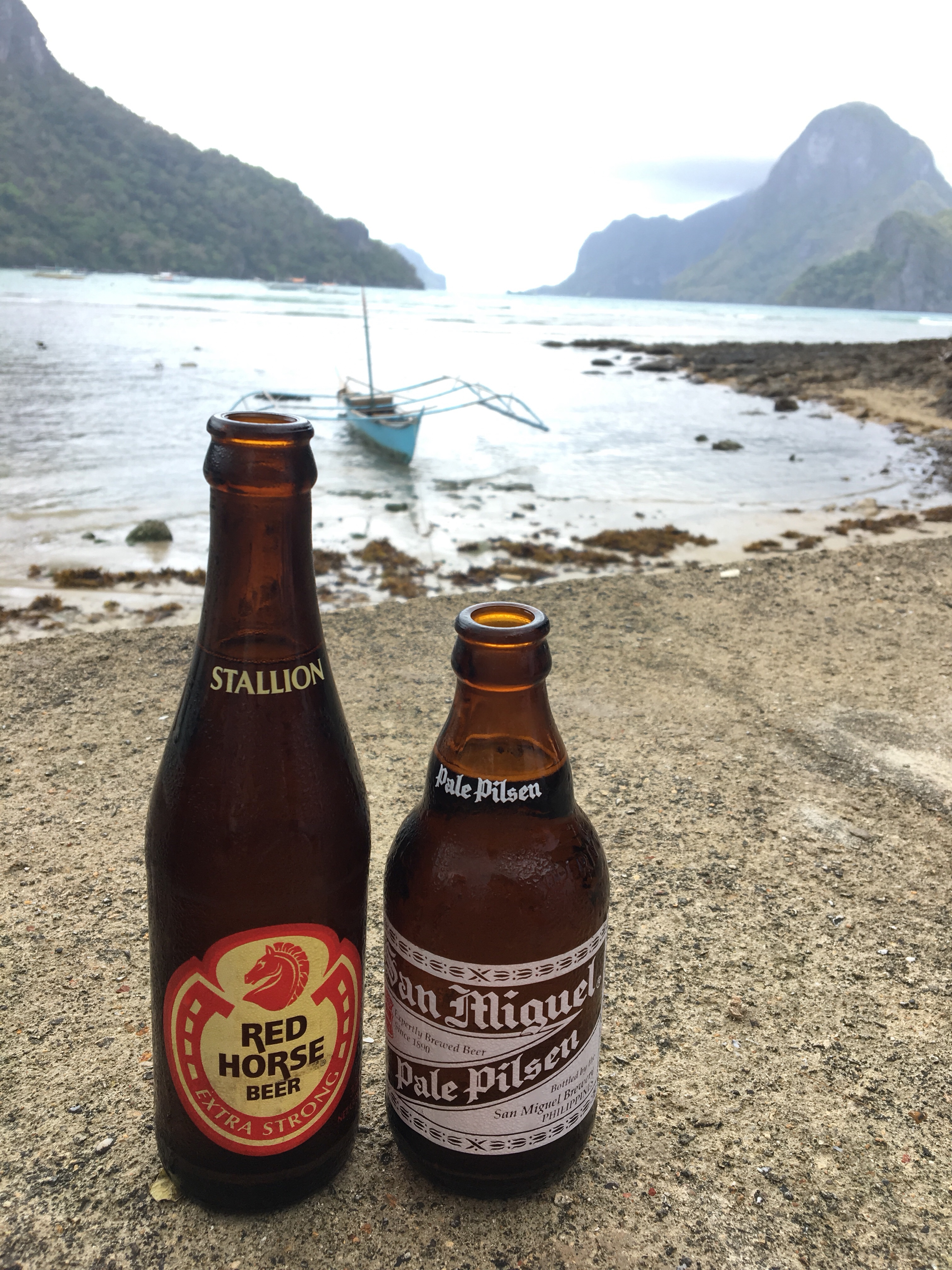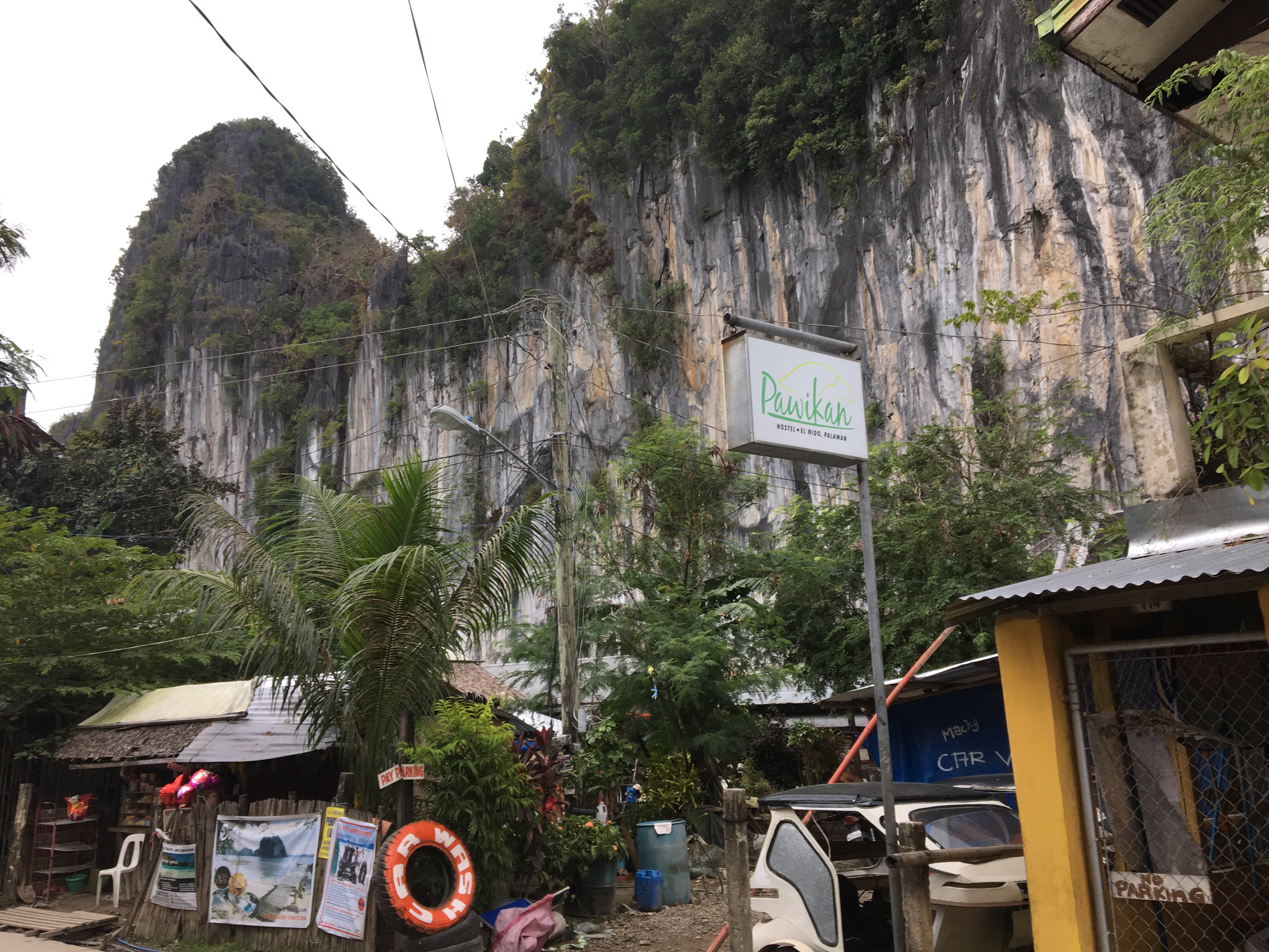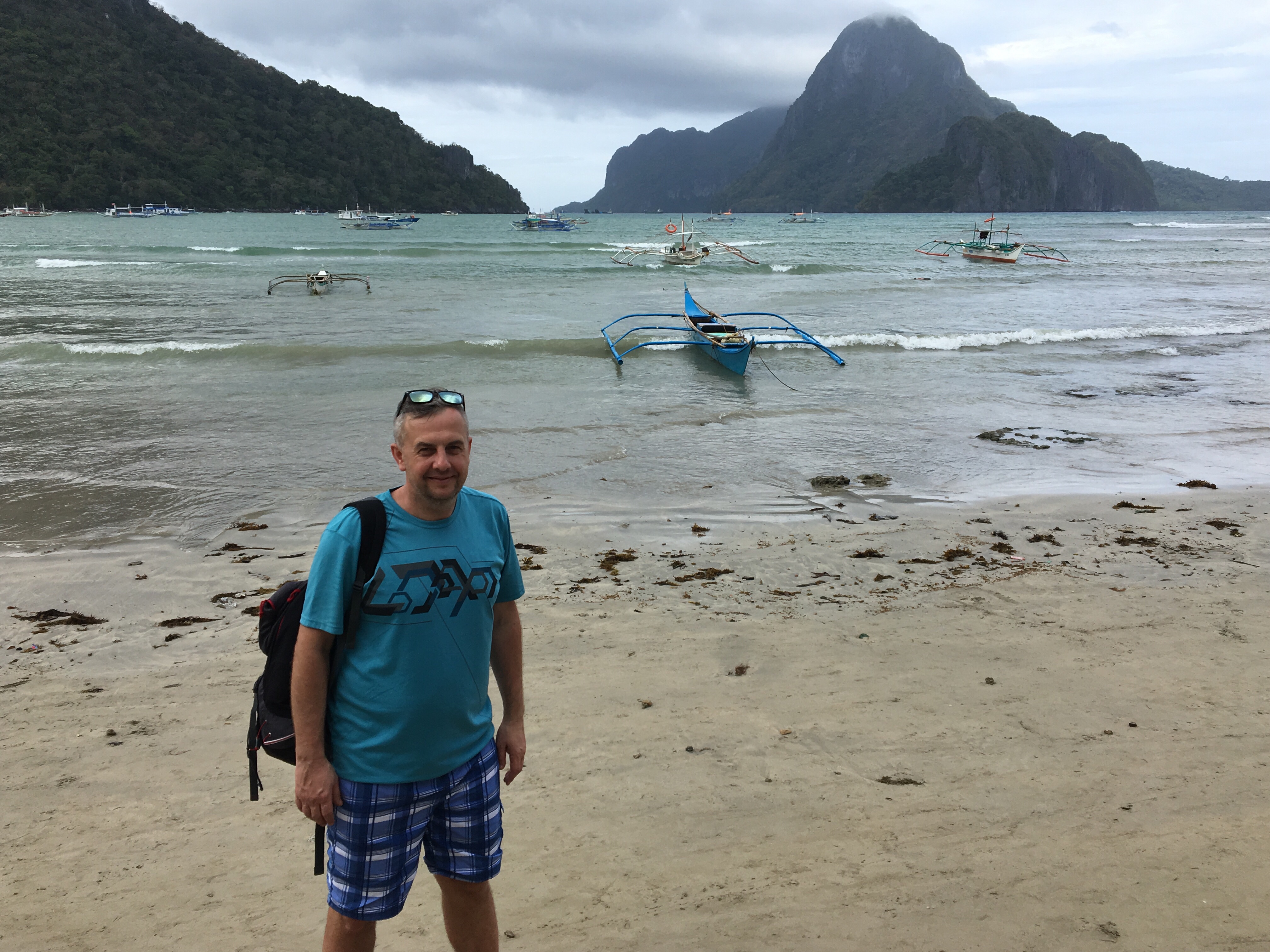 Po snídani a vyřízení ubytování jsme se rozhodli pro půjčení motorky, jenže než jsme se rozhoupali, byly všechny fuč. Tak jsme zvolili náhradní plán, nechali se odvézt do centra a prošli podél pobřeží na vedlejší Caalan Beach, která sice není moc na koupání, ale jako celé El Nido je nesmírně fotogenická. Houpající se bangky a za nimi panorama Bacuitských ostrovů.
