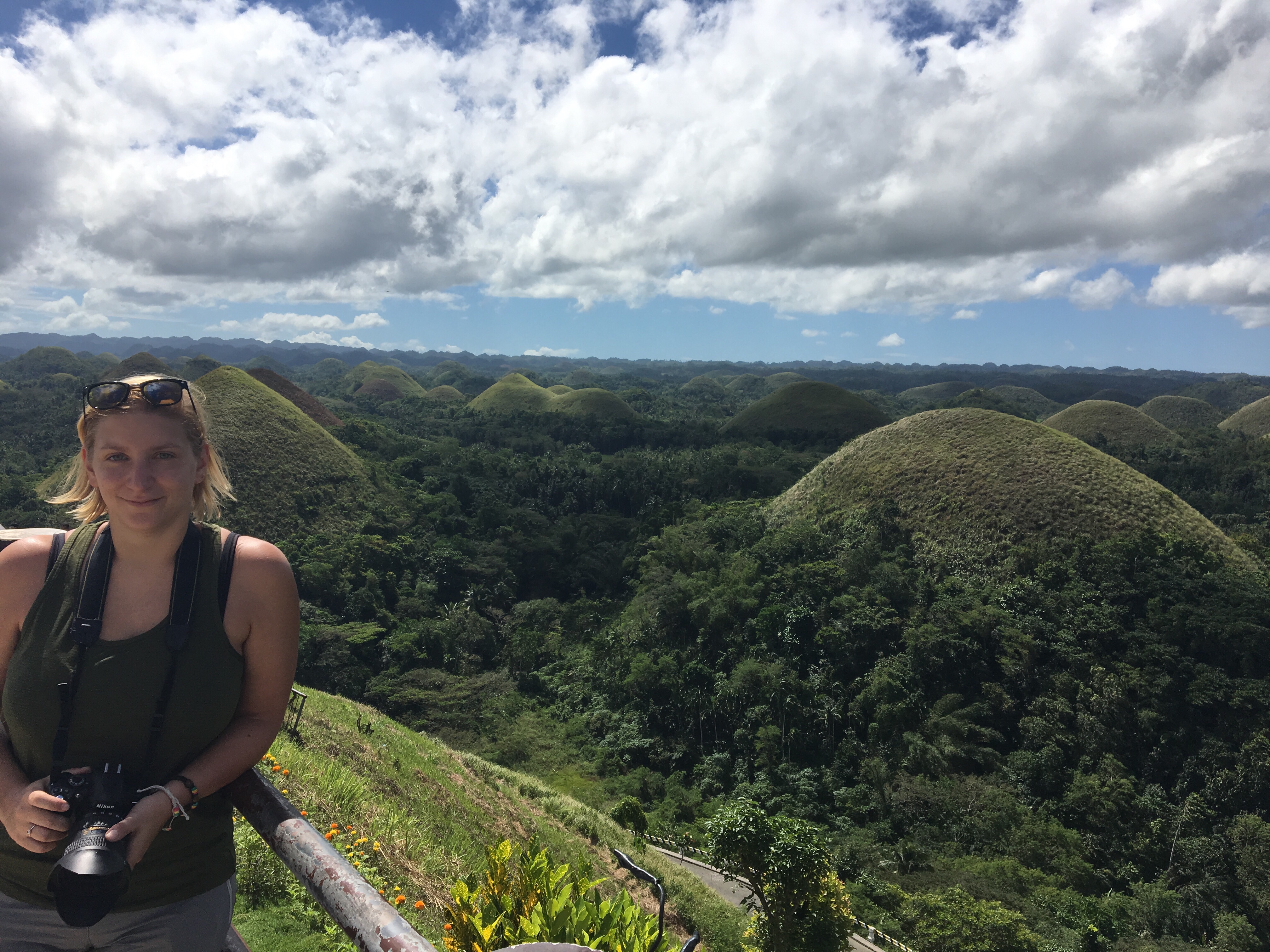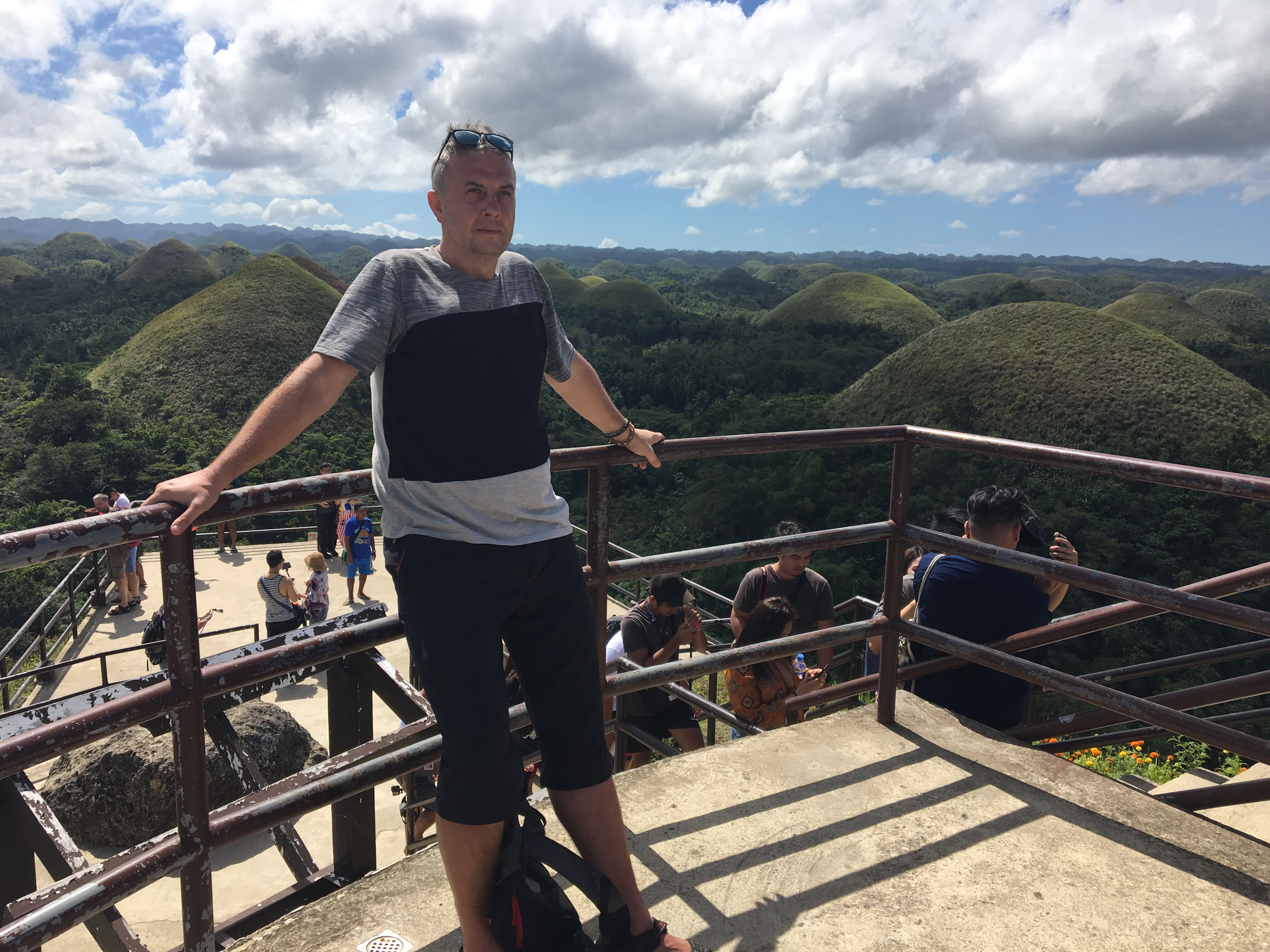 Populární čokoládové kopce jsou opravdu krásné a jsme rádi, že jsme je mohli vidět a tak si i odtud vezmeme trička. Při zpáteční cestě hodíme koupačku pod vodopády Pangas, projdeme motýlí klecí a přejdeme dva provazovo-bambusové mosty / to bylo trošku adrenalinové/ až dorazíme na místo kde se starají o to, aby nevyhynula opička Nártoun filipínský.