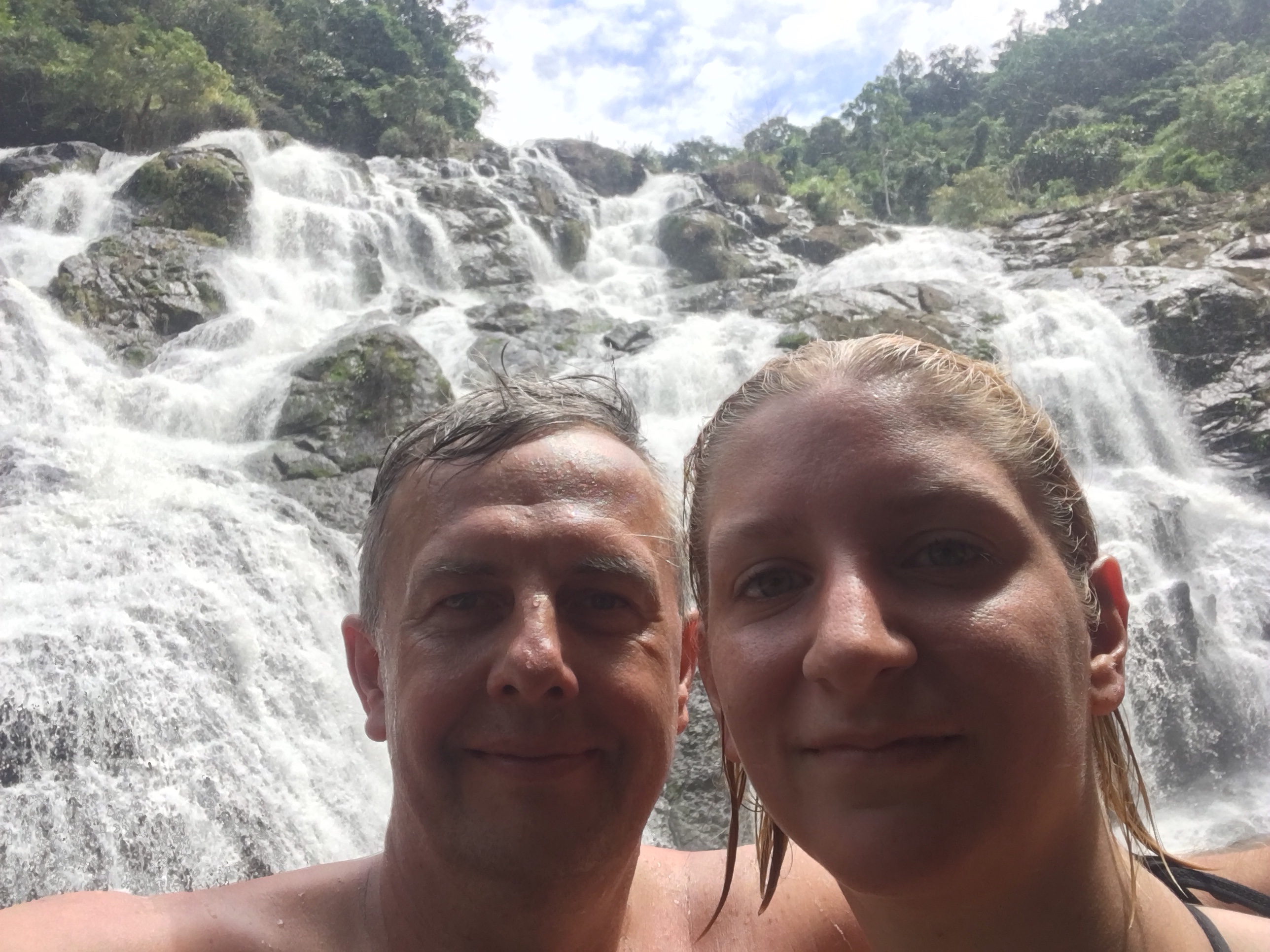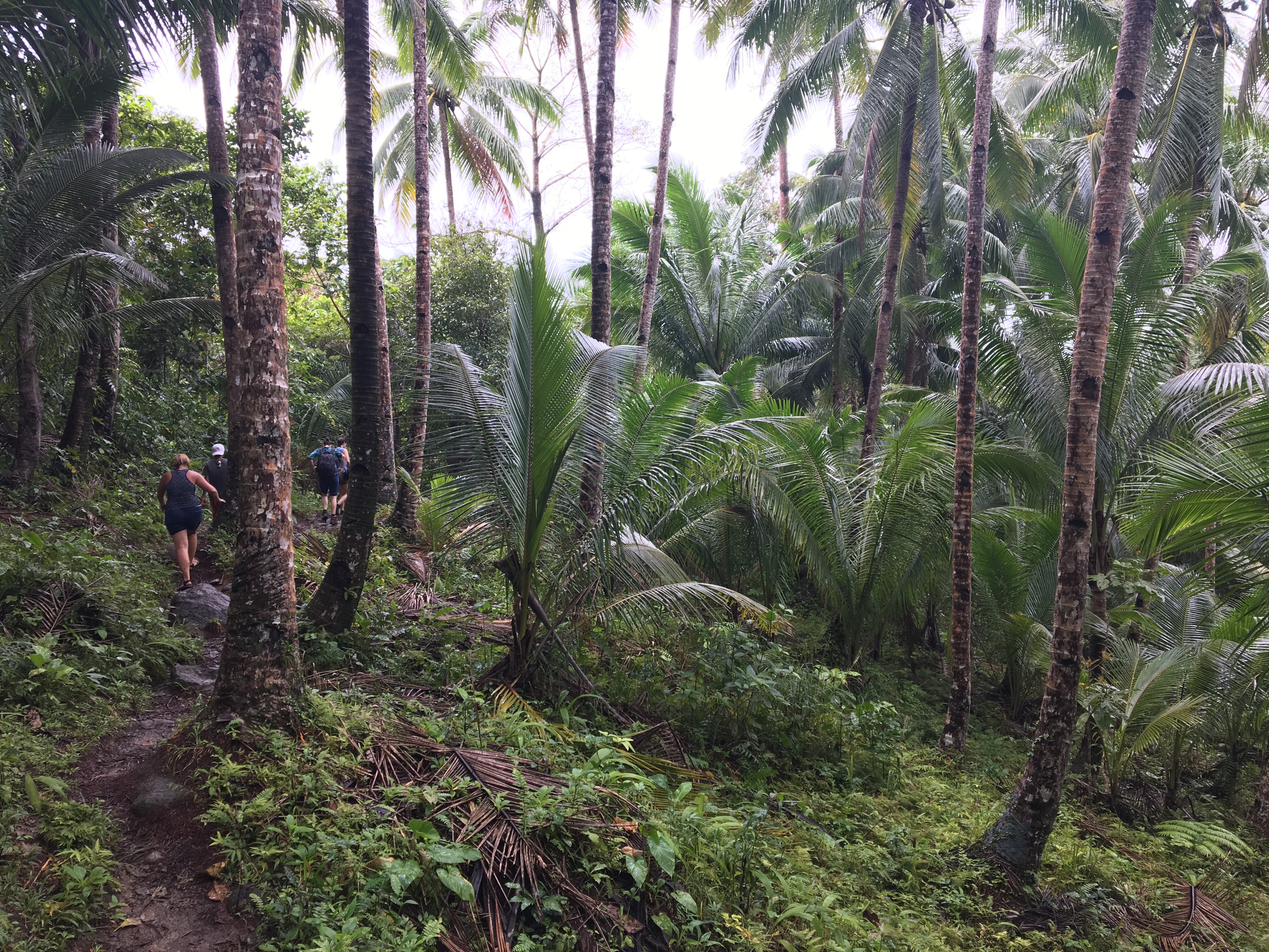 Tentokrát jsme ani nepřejeli náš cíl, vystupujeme v Tinaplacan po asi 1,5 h jízdy. Výhoda jízdy po deváté: nejede vás 40 v autě pro 20. 😉 V osadě, kde vystupujeme, se nás hned ujmou a platíme 20 pesos za průvodce, naloží nás na trojmístnou motorku a jedeme ještě kus po silnici k prvnímu vodopádu Bangon. Tam se nestačíme ani rozhlédnout a průvodce nás ženě džunglí do kopce. Je po dešti, takže cesta je pěkně uklouzaná. Filipínec si to ovšem dává v žabkách. 😜 Nutno podotknout, že v terénu nám pomáhá, jak se dá, ukazuje cestu, drží mě za ruku, nese nám boty … je zlatý.
