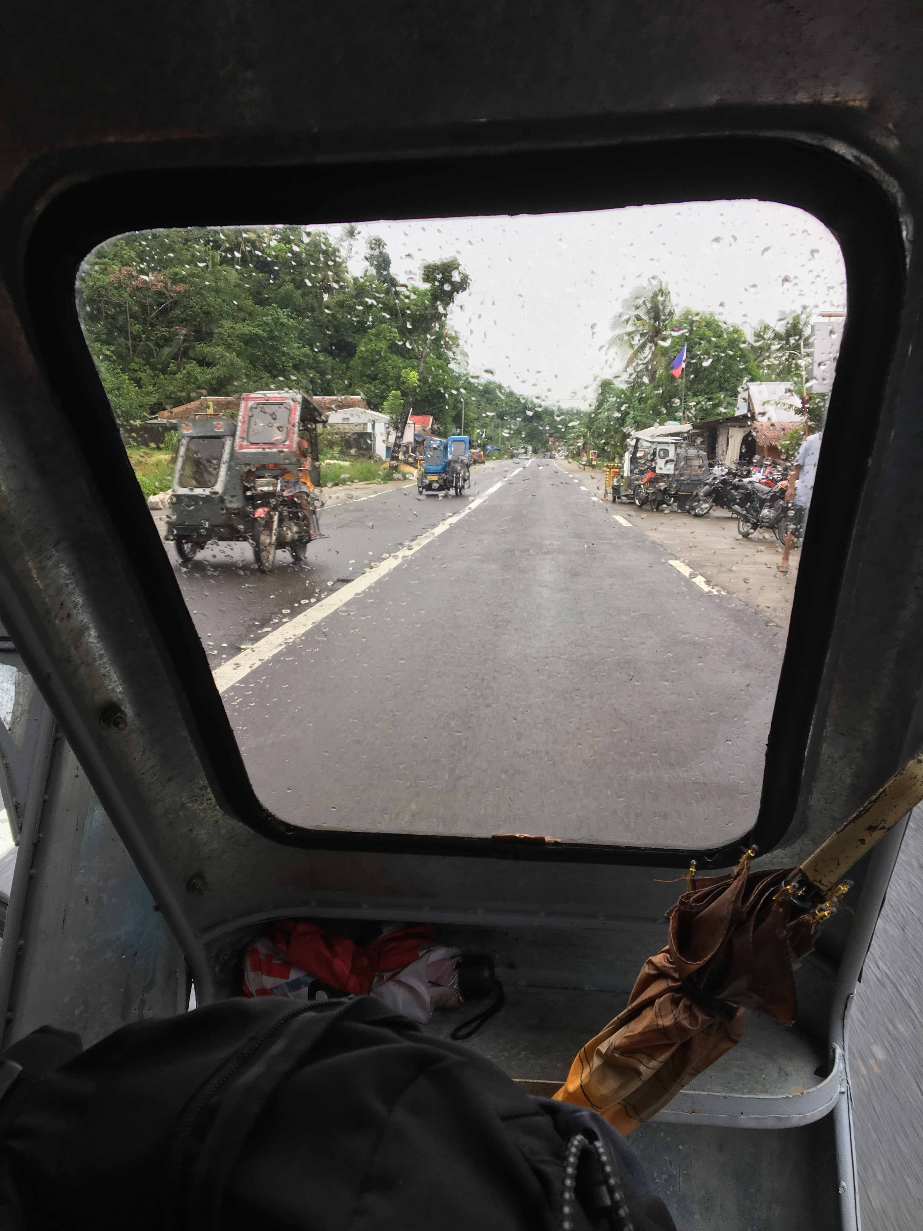 Vycházíme v 5:00. Uličky jsou tmavé a liduprázdné, jen z dálky občas zaslechneme motorku. Padá jemný déšť a my vyrážíme sehnat odvoz do San Isidro odkud nám možná pojede trajekt v 9:00, ano možná, informace jsou neurčité. Na hlavní ulici chytneme tříkolku, která s námi zajede na 3 VAN terminály a 2 BUS terminály a až na tom druhém chytáme jeepney směr Allen s odjezdem v 5:30.