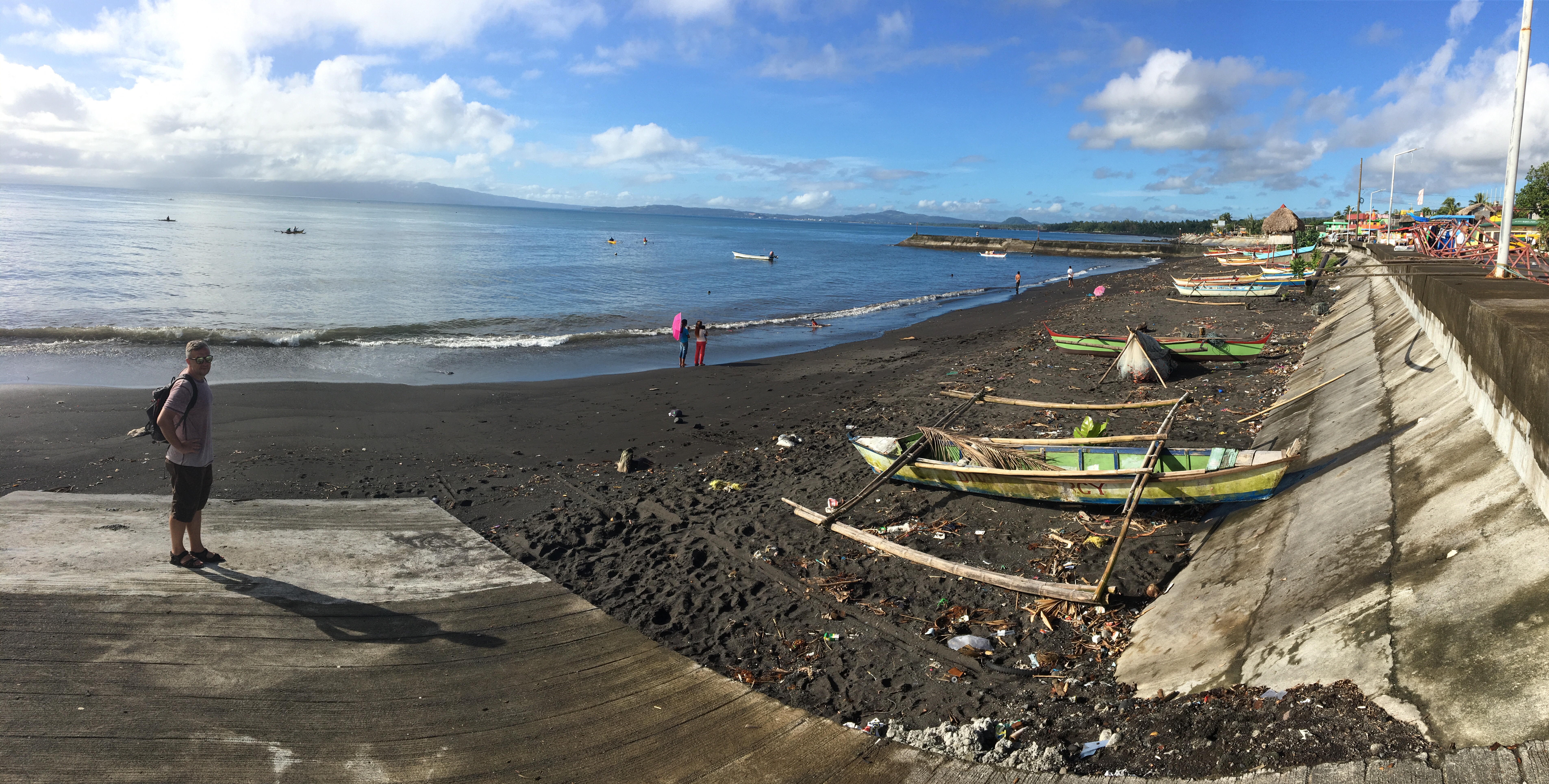 Toto městečko v Albayském zálivu s černým pískem na pláži s Filipínským mořem a sopkou Mayon v pozadí, je plné rezortů pro „mastňáky“, ale i tak jsme si tam místo na procházku a snídani udělali 😉
