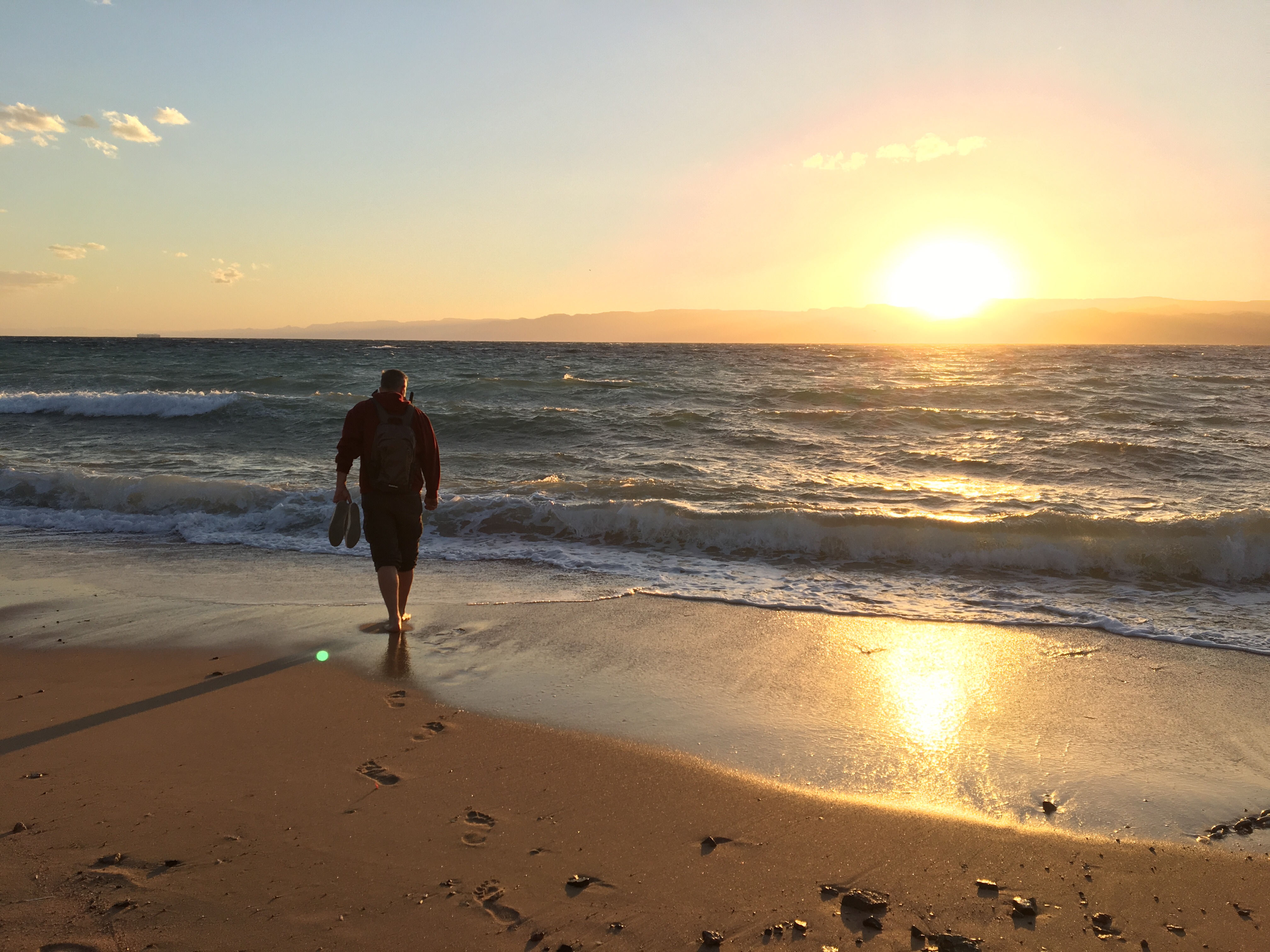 Další hodinu strávíme cestou do Aqaby, kde dnes nocujeme v pěkném hotelu Al Qidra. Máme ještě kus odpoledne a večer na procházku po městě, které tady pořádně žije. Stíháme i smočit končetiny v Rudém moři. Taky utrácíme poslední dináry za dárečky a večeři z mořských plodů se salátem tabouleh.
