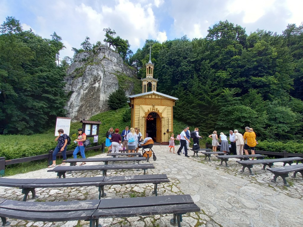 Po hodince jízdy míjíme dav lidí mířící na křest holčičky do dřevěné kaple sv. Josefa Robotnika na vodě. Když jsme se zorientovali v davu a poobědvali jsme zapečené sýrové a masové pirohy – mají je tu opravdu výborné – vyrazili jsme do vesničky Ojców.