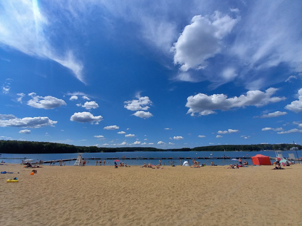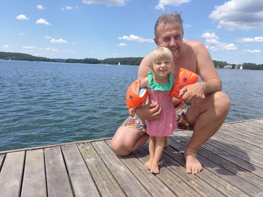 Město Olsztyn je vstupní branou do oblasti Mazurských jezer a máme to tam hodinu a půl cesty, kterou Adi i Terka prospí. Parkujeme u rekreační zóny u jezera Ukiel a jdeme se zchladit na městskou pláž. Teploměr ukazuje 27 stupňů.