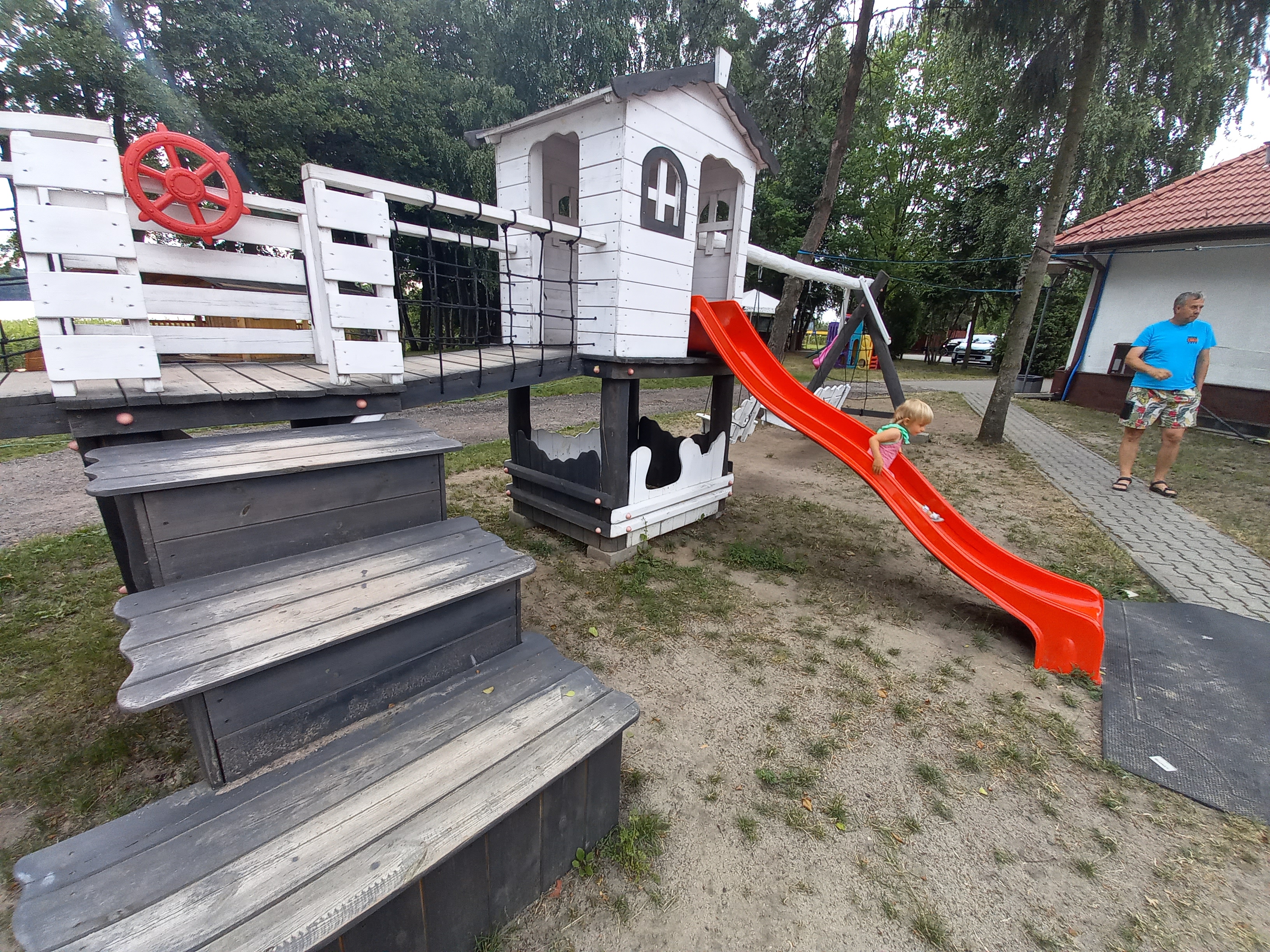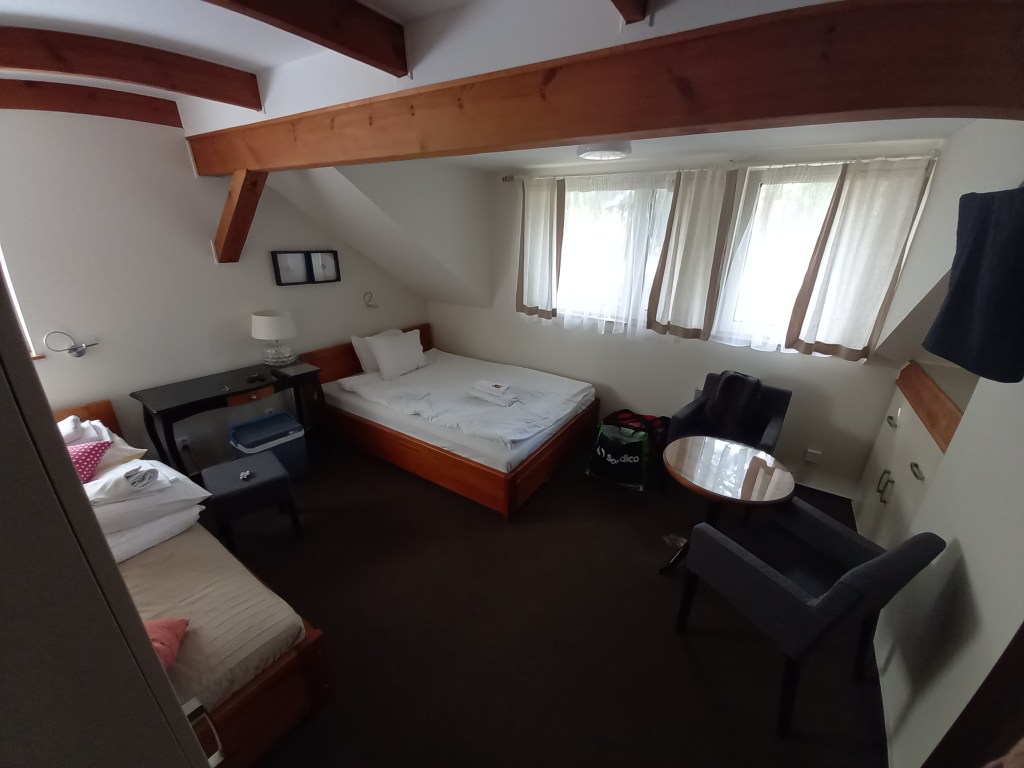 Když teplota klesne na přijatelnou mez, jdeme shánět ubytování, tentokrát pod střechou, zítra má celý den pršet. Vyhlédnutý “hotelik” u jezera má plno, paní nás posílá o 2 km dál, ale my cestou objevujeme bed & breakfast Bałtycka44 za dobrou cenu, s venkovním i vnitřním posezením a kuchyní k dispozici, takže máme vybráno.