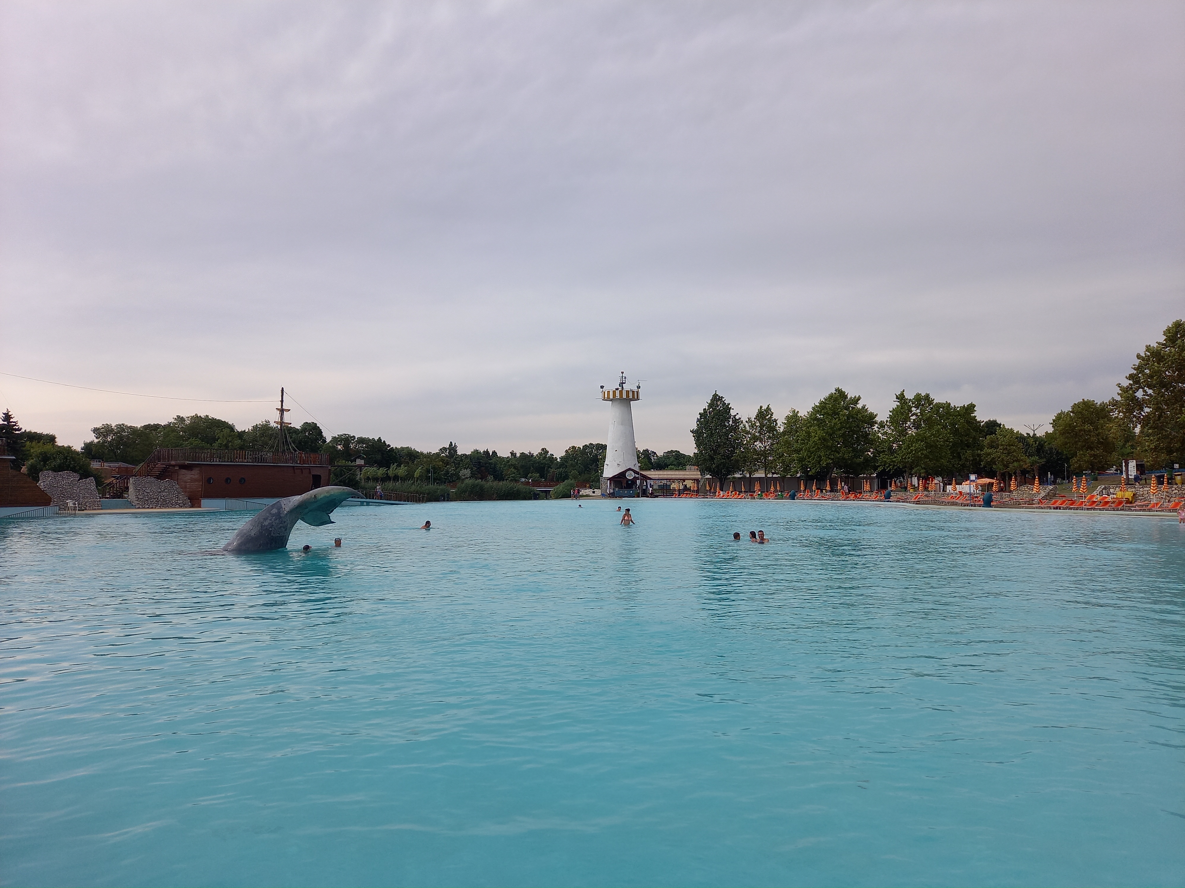 Všimli jsme si ale, že se rychle kazí počasí, a tak nastal čas najít restauraci na oběd. Nechali jsme tam 10.000 HUF za dobré jídlo a strašnou obsluhu a jelikož po obědě pršelo už vydatně, opustili jsme Debrecín s plánem vykoupat se v aquaparku v nedalekém městě Hajdúszoboszló. Nepočítali jsme ale s tím, že se do vnitřního aquaparku nevejdeme a museli jsme se spokojit s venkovním termálním koupalištěm. Voda byla teplá (čím hnědší tím teplejší), ale foukalo, takže jsme ani nezvládli prozkoumat celý areál, který byl opravdu obrovský. Později jsme se dočetli, že lázně Hungarospa jsou v této oblasti nejoblíbenější a ročně je navštíví přes 1,5 milionu lidí.
