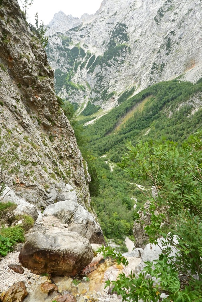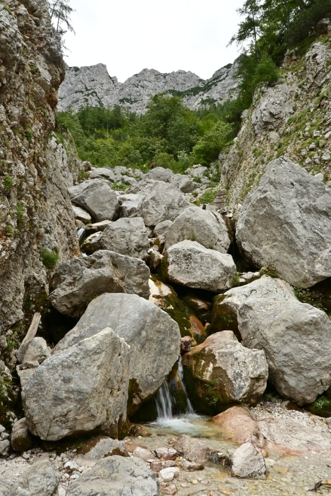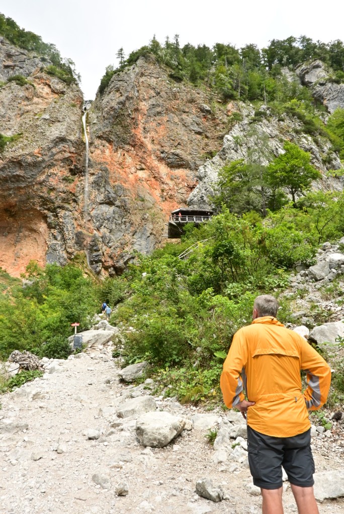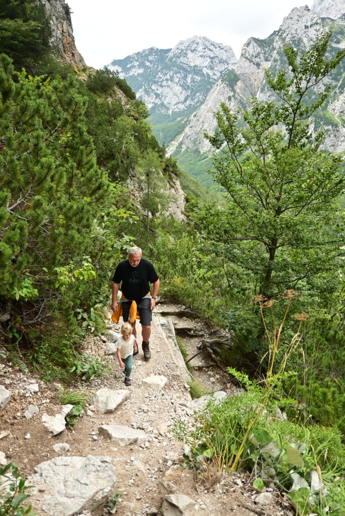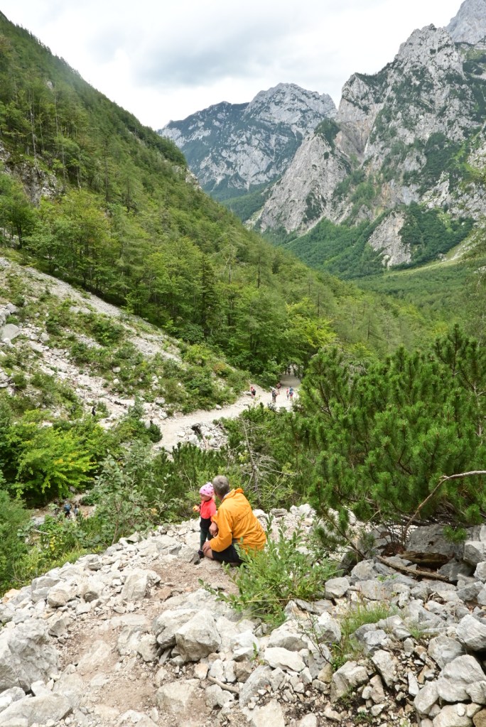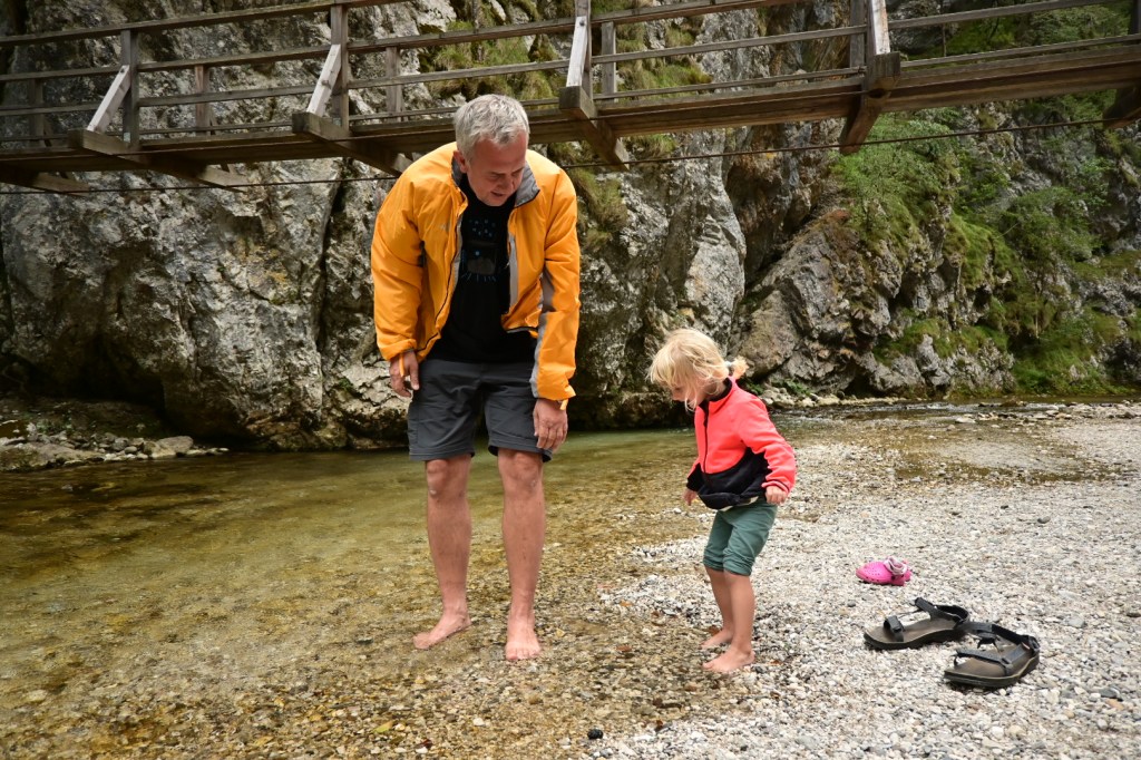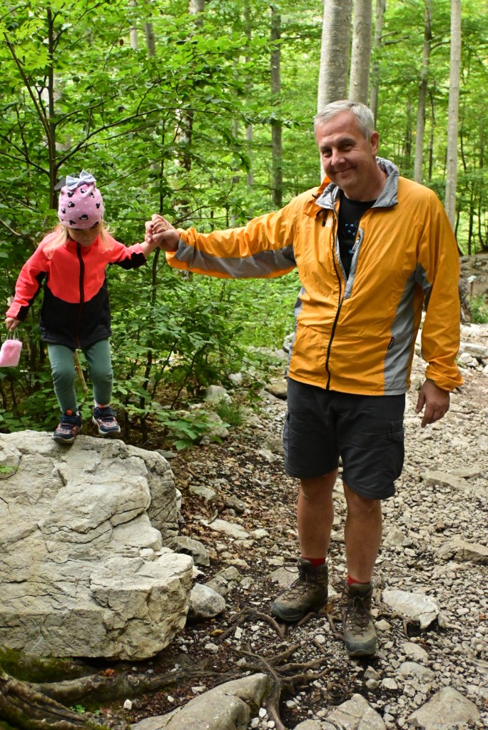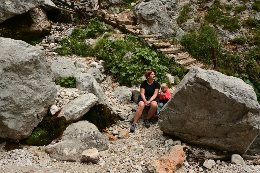 Samotný vjezd do Logarske doliny je zpoplatněn 7 EUR a hned za závorou se ukáže majestátní panorama Alp, jejichž bledá šeď kontrastuje se svěže zelenou trávou. Míříme až na konec doliny, která je protkaná stezkami a bylo by skvěle strávit tu více času. My se ale chystáme na nejprofláklejší místo doliny – vodopád Rinka, kam, doufáme, zvládne dojít i Adinka po svých. Suché koryto potoka naznačuje, že se možná vodopádu ani nedočkáme. Ale byl tam! A Adinka byla tak statečná, že zvládla nejen cestu pod vodopád, ale i 125 metrů převýšení nad vodopád a samozřejmě to samé zpět. Lezení po skalách ji evidentně naplňuje víc než běžná chůze.🙂