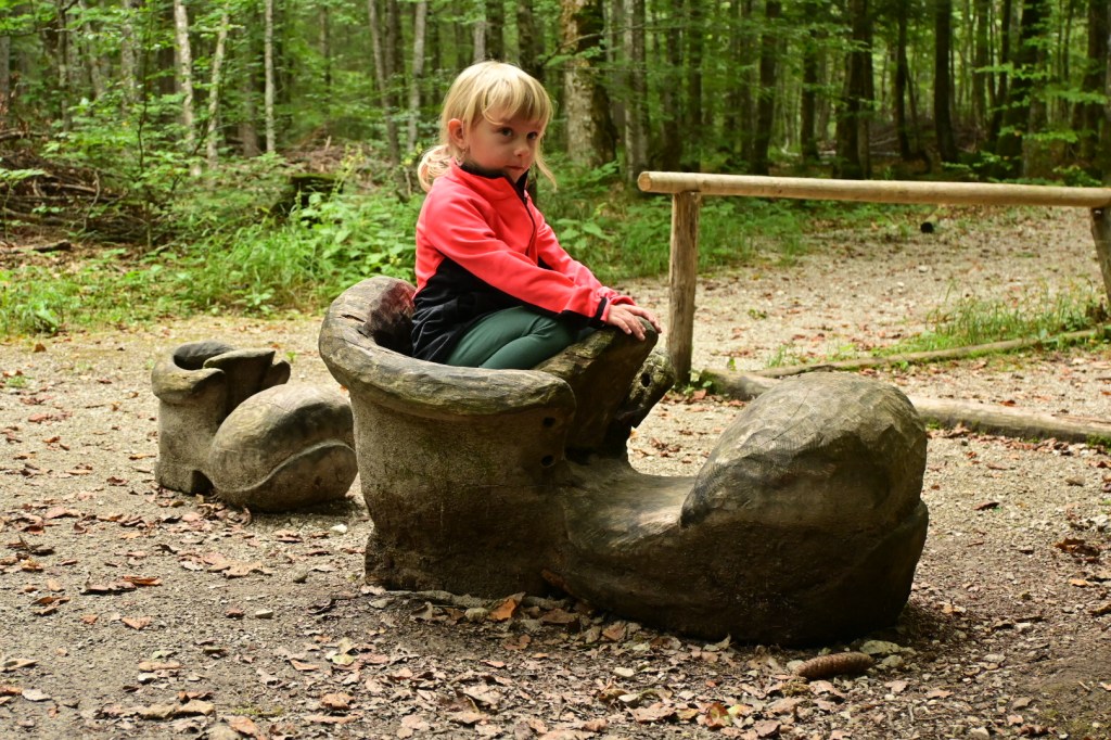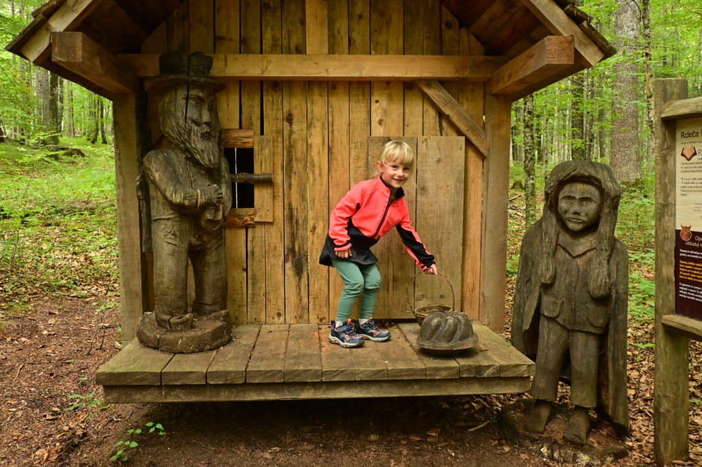 Po sestupu jsme nakoupili oběd ve farmářském automatu a sjeli dolinou níže k penzionu Na razpotju, odkud se vchází do pohádkového lesa. To byla moc pěkně udělaná stezka s domečky a vyřezávanými pohádkovými postavami, odkud se Adince vůbec nechtělo. Pak jsme se museli odměnit kávou a polévkou.🙂