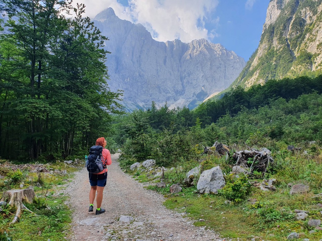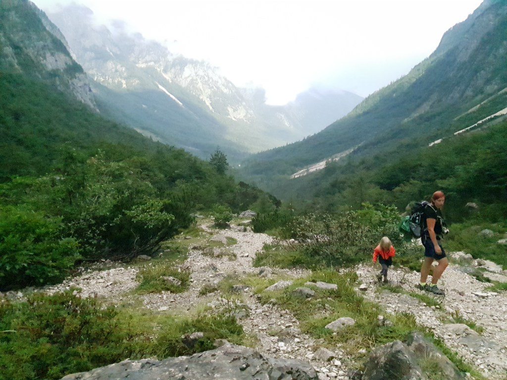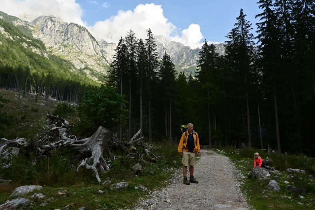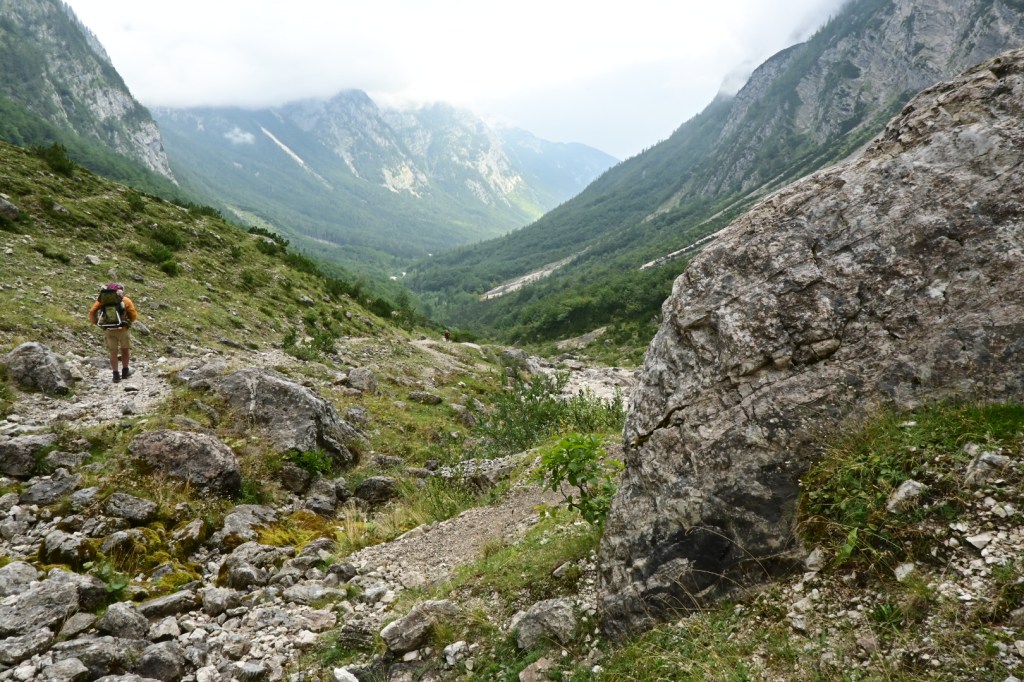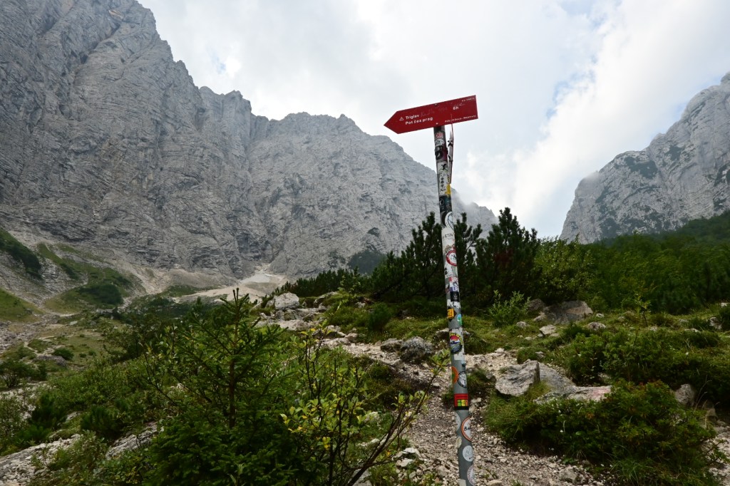 Ráno nám počasí opravdu přálo, a tak jsme se mohli kochat okolními impozantními skalními masivy v celé jejich kráse. A že bylo co obdivovat. Zdola vypadá severní stěna Triglavu naprosto nepřístupně, když se zvedá skoro kolmo vzhůru o 1800 metrů výše. Ale ani okolní dvoutisícovky nejsou zanedbatelné. Cesta údolím je sevřená ze všech stran parádními skalními velikány.