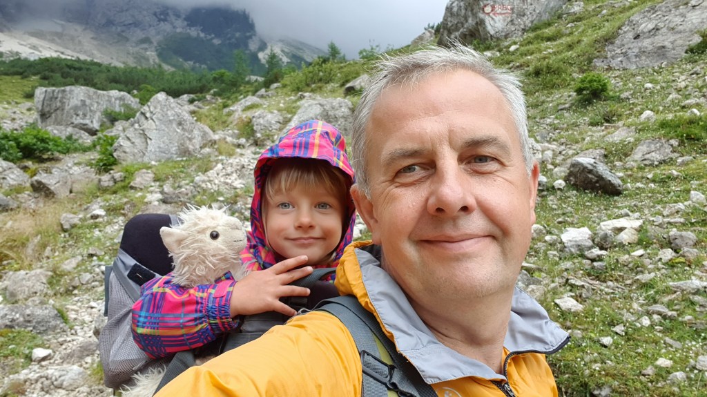 Adinku cestou zaměstnaly balvany podél cesty, na které mohla šplhat a nekonečné variace na pohádku O Smolíčkovi. 🙂 Aspoň byla legrace. I přesto, že nám cestou pršelo a šli jsme v pláštěnkách. Jen co jsme dosáhli cíle, přihnaly se ještě šedivější nízké mraky, a tak jsme rychle posvačili a vydali jsme se stejnou cestou dolů. Občas zabouřilo, takže nahoře na hřebeni na ferratě bychom tou dobou být určitě nechtěli.
