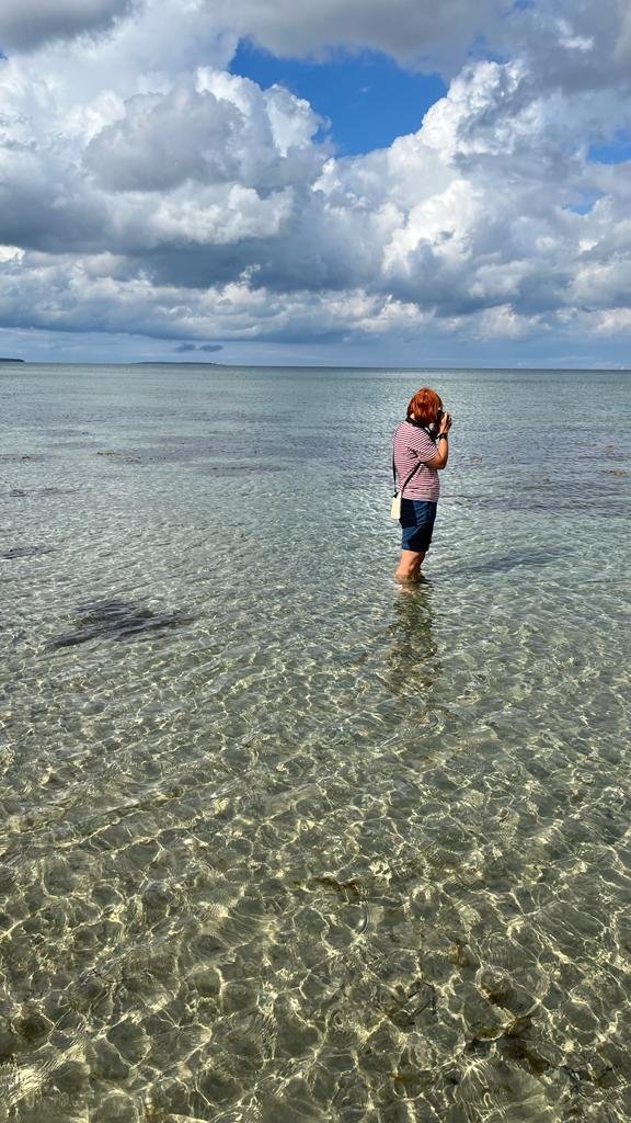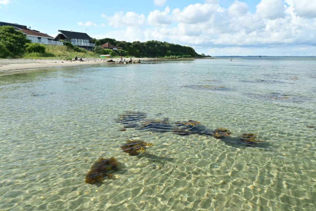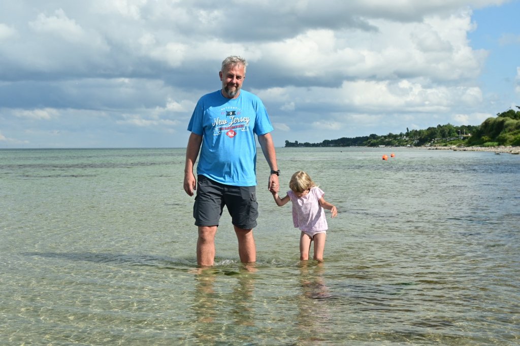 Nakonec se tak oteplilo a vyjasnilo, že jsme ještě zajeli k pobřeží u městečka Kerteminde, kde mají být nejkrásnější pláže. Jede se k nim sice po polňačce mezi obilím, ale pláž, kterou jsme navštívili, byla opravdu příjemná s jemným piskem, voda průzračná a vlastně ani ne tak studená. Ale plavky jsme nechali ve stanu, tak byla koupačka jen po kolena.