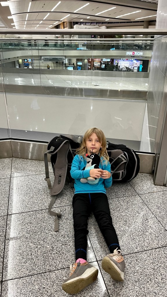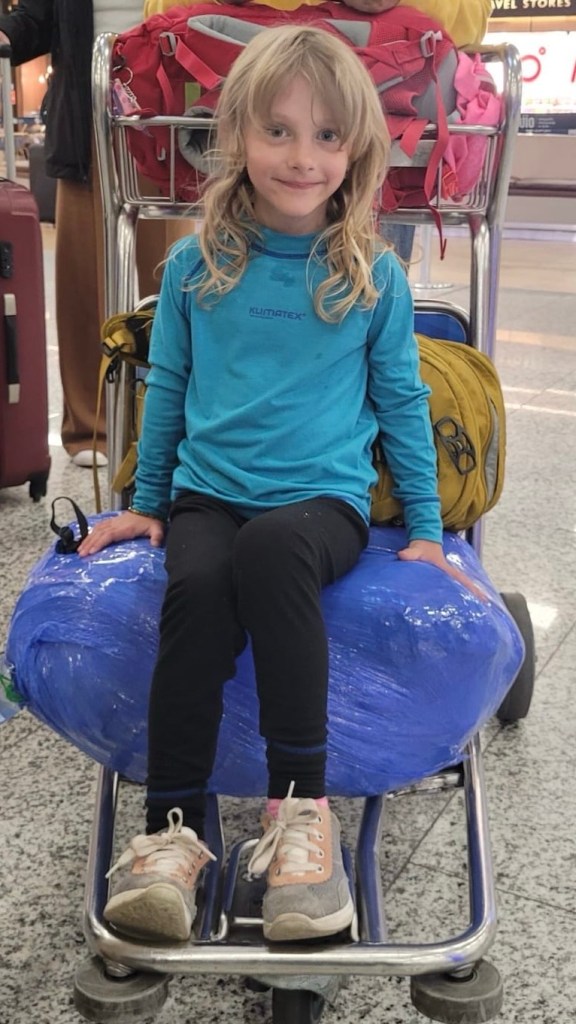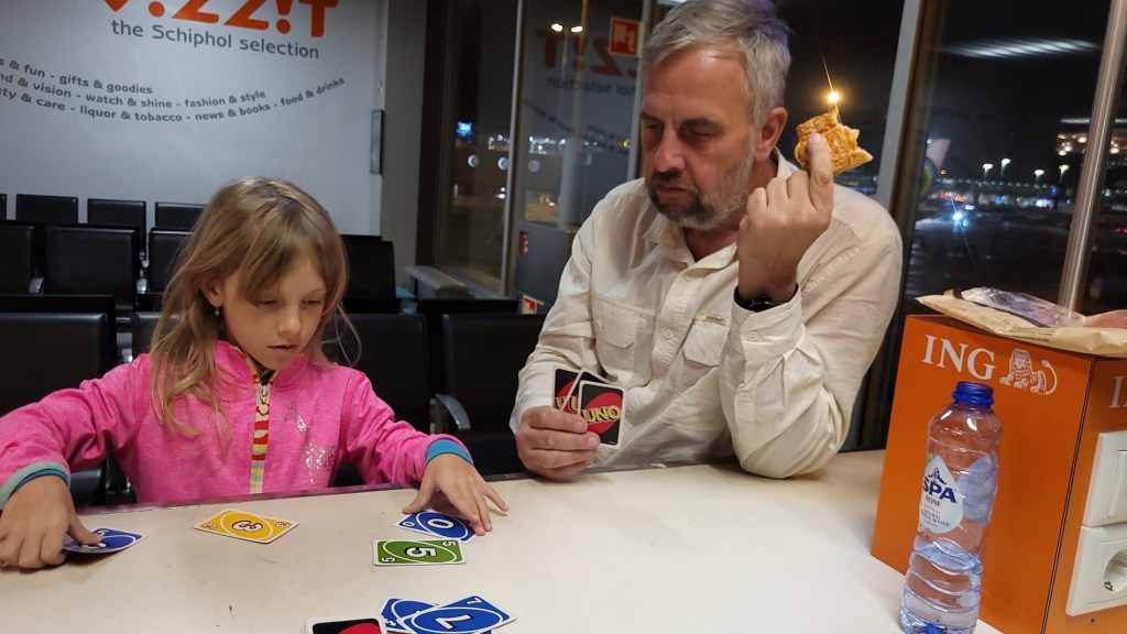 Na letišti platí přísná kontrola, kdy vás do budovy terminálu pustí po předložení pasu a letenky. To nás uklidní a máme 8 hodin do odletu. Kupujeme různé dárky a výrobky místní produkce a hrajeme karty. Spící Adinku odnášíme do letadla a po 5-ti hodinách přistáváme v Atlantě ve státu Georgia. Tady tvrdneme dokonce 10 hodin, než se vydáme na 8 hodinovou cestu do Amsterodamu a následně hned do Berlína. Po dvou dnech na cestě nám zbyla ještě tří hodinová cesta autem ….. jo a naše první kroky vedli do obchodu pro pečivo a zeleninu 😘
