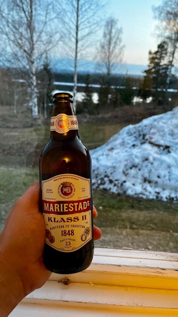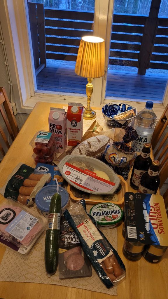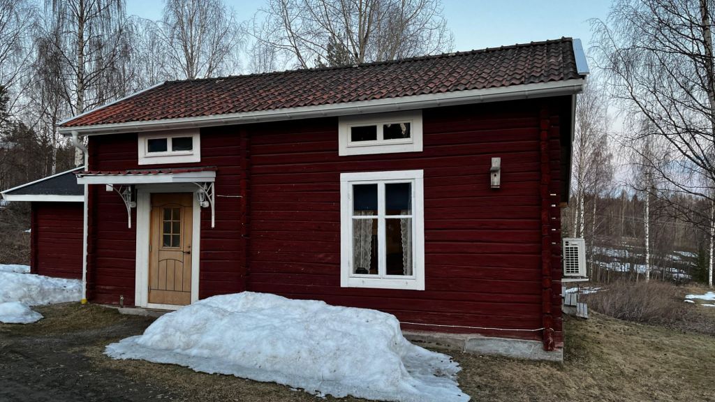 Seznamujeme se s půjčeným hybridním Peugeotem 3008 a vyrážíme na hodinu vzdálené ubytování. Tušíme, že v téhle pustině bude o otevřené obchody nouze, takže hned v prvním větším městě nakoupíme zásoby. Kolem silnice se jsou nekonečné březové háje, mezi kterými prosvítají temně modré vodní plochy, s kterými kontrastují červené dřevěné domky. Zbytky sněhu vidíme všude kolem.