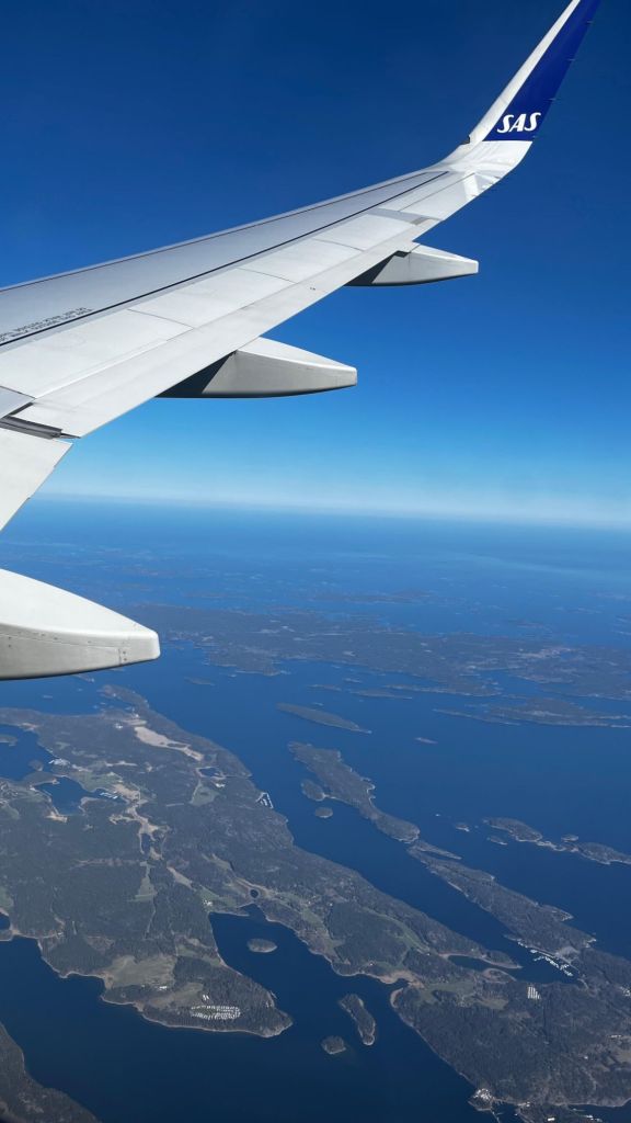 Výhledy z letadla na tisíce ostrovů rozesetých v moři byly famózní. Moje dilema, jestli ve Švédsku v květnu bude ještě sníh, se rozuzlilo. Pod námi jsou obrovské sněhové plochy. Sněhule nicméně zůstaly doma. Po přistání zjišťujeme, že to snad nebude tak horké, sníh pomalu odtává, jelikož denní teploty se pohybují lehce nad nulou.