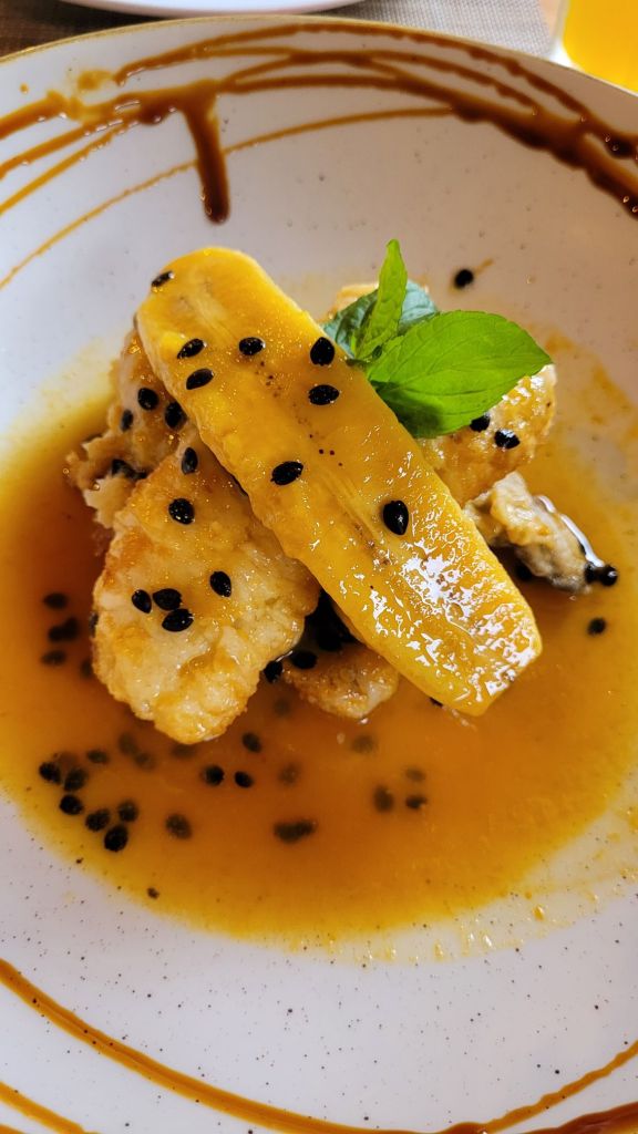 Počasí jsme vychytali, až při cestě zpět se začaly vrcholky halit do mraků. Ale to už bylo poledne a my jsme spěchali uhasit hlad. Původní plán navštívit nedalekou pstruží farmu zkrachoval kvůli množství turistů parkujících kolem, takže jsme popojeli až do horské vesnice Ribeiro Frio a zapadli do luxusně vypadající restaurace Jardim do Vale. Dobře jsme udělali. Espada s banánem a maracujou byla skvělá. K tomu tomatová polévka, česnekový chléb bolo do caco a espetada (špíz) z kuřete s přílohou milho frito. Samé místní speciality na jedničku připravené.