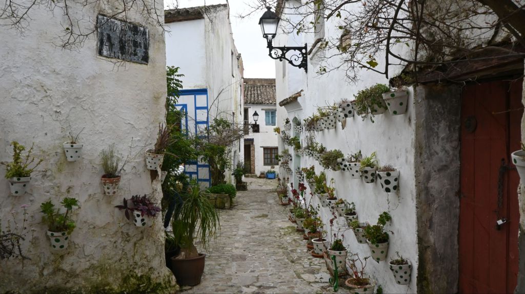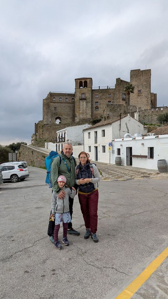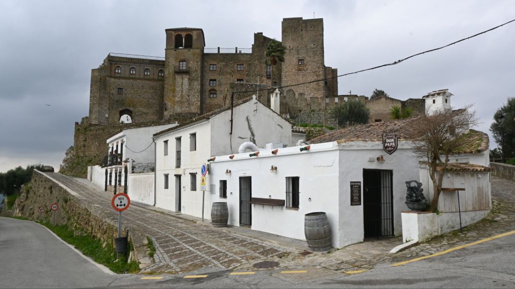 Cestou od nocležiště k hradu vidíme z auta desítky hnízdících čápů, tak už víme, kam létají přezimovat. Od silnice už jsou také vidět “oholené” korkové duby, kterých je tu bezpočet. K hradu musí náš náklaďáček nastoupat 250 metrů po úzké silnici, ale naštěstí se tu s nikým nemusíme míjet. Překvapuje nás, že není nikde žádná brána, žádné vstupné… Noříme se tedy do středověkých uliček podhradí, kde to vypadá, že stále někdo bydlí. Fotíme malebná zákoutí a hledáme kešky. Když se vymotáme, zjišťujeme, že samotný hrad funguje jako hotel a nedá se do něj dostat. Ale to vůbec nevadí, nám to takhle stačilo.
